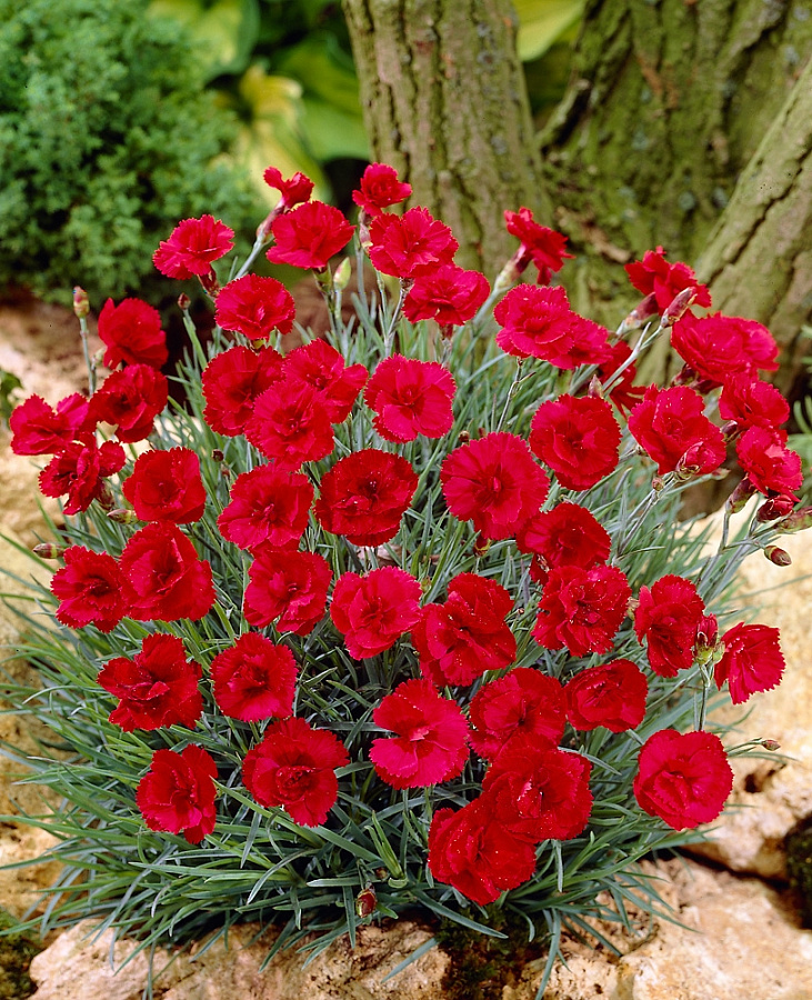 Саженцы Гвоздики перистой Минот (Munot Dianthus) будут прекрасно смотреться на любой клумбе, они удачно сочетаются с самыми разными садовыми культурами. Тем более, что это растение сохраняет свою декоративность на протяжении всего года и особо великолепно в период активного цветения, в июне – июле. Цветок практически полностью покрывается изящными ярко-красными цветами, излучающими мощный аромат. Эти растения привлекают в сад насекомых-опылителей, поэтому их рекомендуют для высадки в непосредственной близости с фруктовыми деревьями и кустами.
