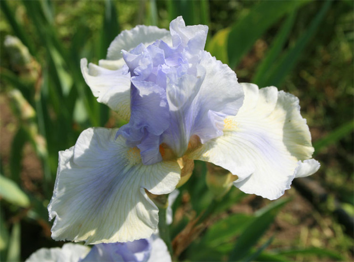 Рассада Ириса Херс (Hers) отлично подходит для оформления клумб со среднерослыми декоративными растениями. В начале июня на крепких стеблях распускаются пышные, крупные бутоны, испаряющие волшебный, нежный аромат. Нижние лепестки цветка кремово-белые, верхние светло-фиолетовые, бородка жёлтая.