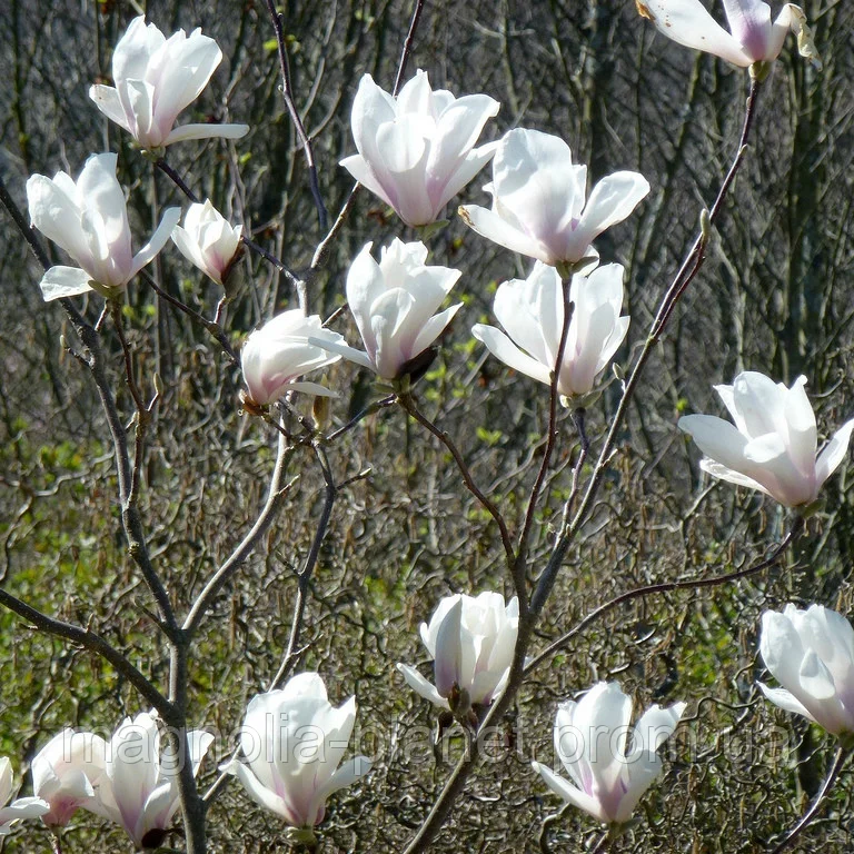 Саженцы магнолии Суланжа Броццони (Brozzoni) вырастут в раскидистые кустарники с низко падающими ветвями и белыми с лимонным оттенком чашами цветов. В распустившемся состоянии диаметр цветка до 15 см. Цветение очень обильное, начинается перед появлением листьев. Крупномеры магнолии Суланжа Броццони достигают 4м. Достоинства: