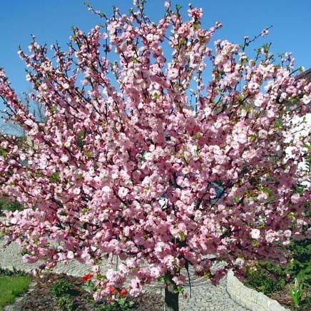 Саженцы Миндаля трехлопастного на штамбе (Prunus triloba) – эффектный кустарник, сменяющий листья каждый сезон. За свою красоту многие называют его японской вишней, но ничего общего, кроме внешнего сходства с сакурой у него нет. Цветы располагаются на побегах, образуют группку из двух бутонов. Лепестки имеют разные оттенки розового цвета. Цветёт этот вид миндаля в апреле-мае.