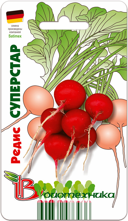 Семена редиса "СуперСтар" (SuperStar) пригодны для позднеспелого выращивания в открытом грунте и всесезонно в защищенном. Сорт скороспелый. Период от всходов до технической спелости составляет 19-21 день. Корнеплоды округлой и округло-овальной формы, с гладкой кожицей ярко-красного цвета. Средняя масса достигает 20-23 грамм. Мякоть белая, плотная, сочная, полуострого вкуса. Главные достоинства сорта: устойчивость к пониженной освещенности и цветушности, дружное формирование урожая, выравненность корнеплодов. Урожай рекомендуется для использования в свежем виде.